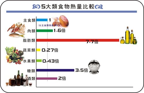 從上表我們可以發現,熱量主要來自主食類、肉類、水果和油脂類食物,蔬菜則非熱量的主要來源。故對於想減肥的人來說,蔬菜並非最適合的食物選擇,反宜以主食類、肉類和水果,及『好』油脂為菜單中的主角。